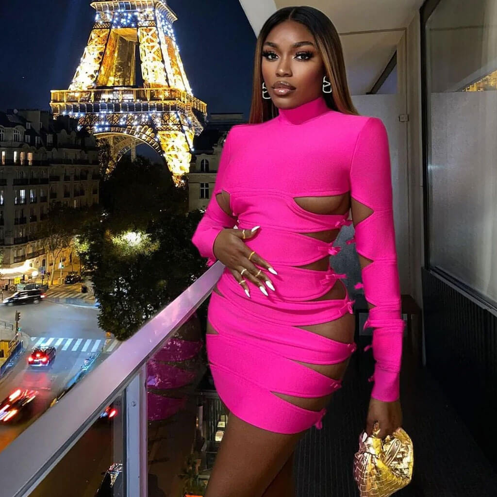 Play up with the vibrant pink shade on the fuchsia trend this season. The mini dress is constructed with stretchy bandage material for a figure-flattering silhouette. Juxtapose with the modest high neck. the flirty dress is detailed with sexy cut-outs at sides and sleeves. while the petite bow embellishment imbues a ladylike vibe to this piece. Featuring a hidden rear zip closure for an easy on. the statement dress is sure to take your look for a standout appeal. Make a bold statement with a tonal look by adding chunky heeled pumps for a perfect touch of femininity.