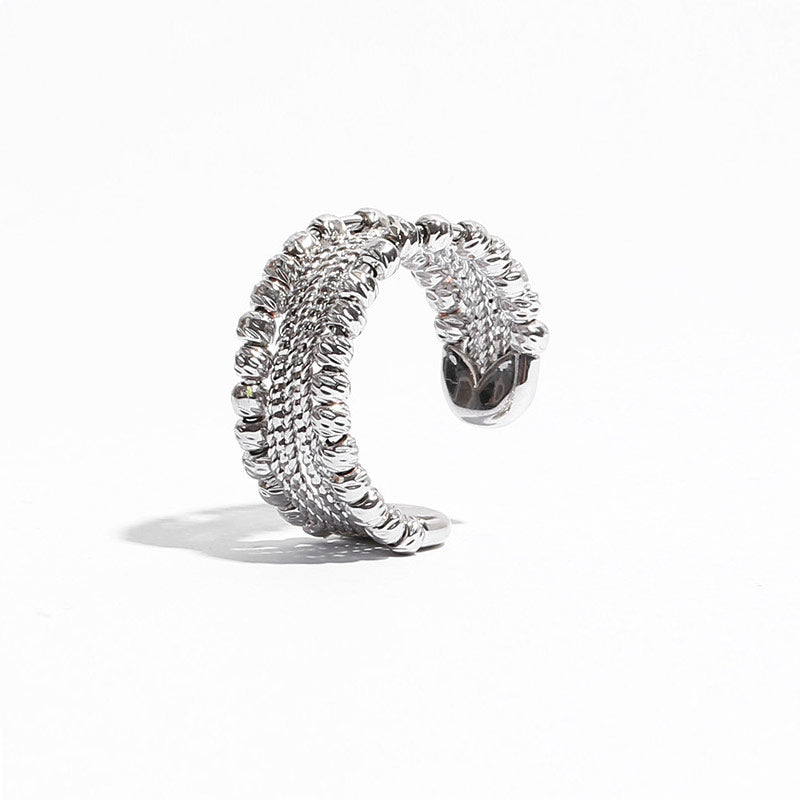 Having an open design with a simple shiny silver finish. this luxury ring is a must have that is perfect for everyday accessorizing. This edgy open ring comes with a layer-band silhouette with metallic beads around and an open end. Wear solo or stack with our accessories for a trendy street look. Our designer jewelry collection will bring out many unique open rings for women. Why not just match your outfit with one?