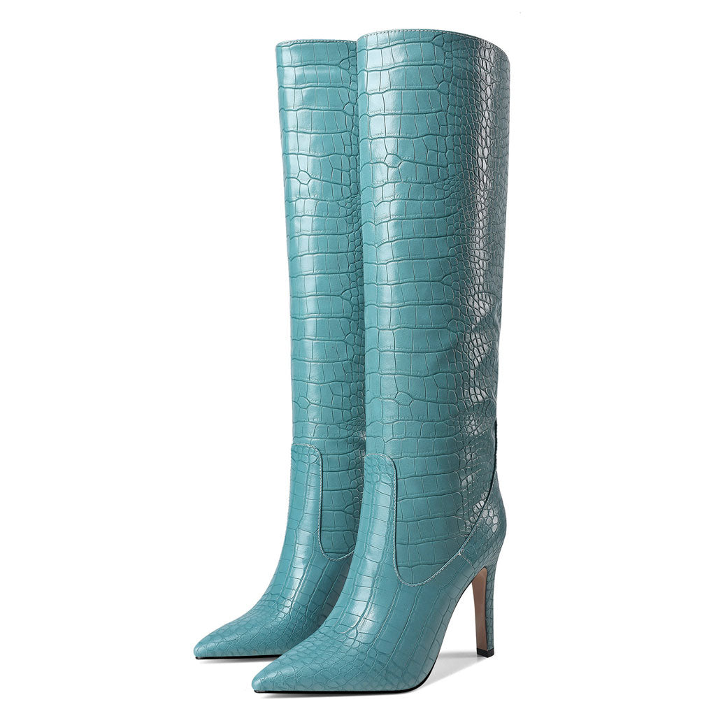 Chic Croc Effect Faux Leather Pointed Toe Knee High Stiletto Boots - Teal