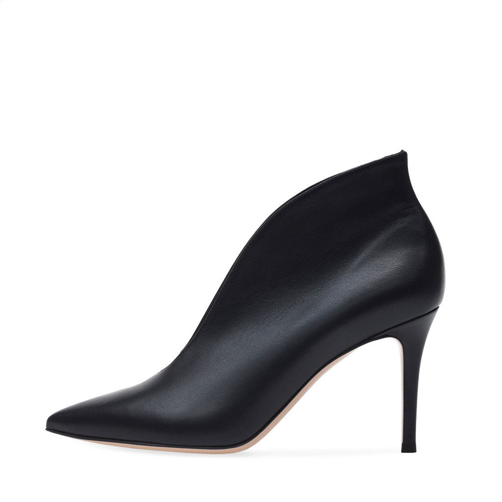No one does effortless chic like these vamp booties. so unique and offbeat. that feel forward and elegant. With a smooth imitated leather finish. they are distinguished by a deep V-cut vamp and a sassy streamlined top line with slinky silhouette to elongate your legs and add drama to an ensemble which feels like a work of art. To give you extra femininity. they feature a pointy toe accent and end with sensual spindly high heels. Offering different color options. they have a wide variety of styles available. Dress it up with your favorite dress and a chain-link bag to complete a contemporary take on refined occasion-wear. Once you slip into the magic shoes. elegant minimalism is done right there!