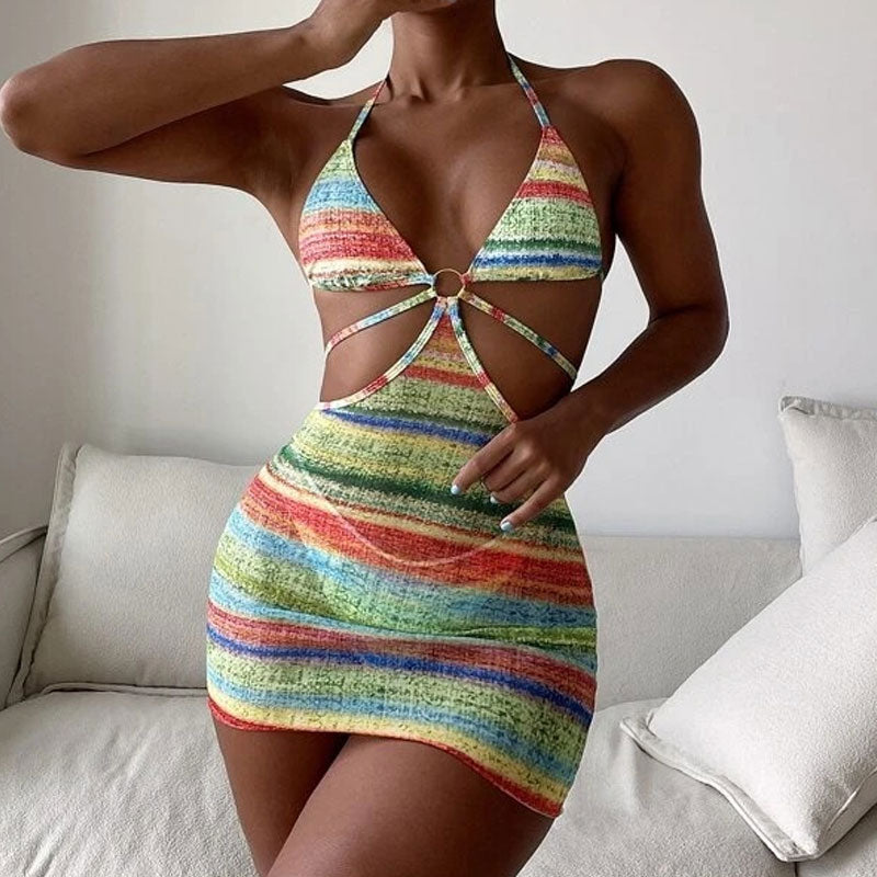 This holiday-ready swimsuit is sure a must-have. Made in a multicolored striped pattern. the two-piece set includes a swim dress and Brazilian cheeky swim bottoms with a high-leg cutting for elongating the legs. The swim dress is designed with triangle cups and removable soft pads. featuring a halter neckline. backless style with string ties at the back. The cut-out waist is enhanced with a chic O-ring design to the front for adding a unique modern look. The dress is a kind of see-through style. giving you the breathable feel. perfect for the laid-back walking along the ocean coast.