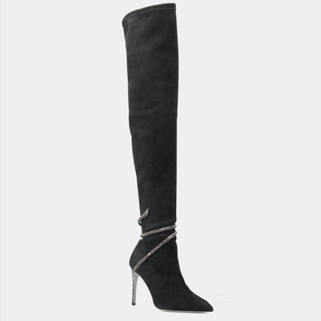 Making a stylish statement comes easy to these classic black boots. They're crafted from supple faux suede for that elegant look into a thigh-high length with a snake-effect rhinestone embellishment wraparound your ankles. The pull-on styling and the right amount of stretch promise a firm yet comfy fit. The sophisticated stunners feature close pointy toe which are finished with sparkly thin high heels ornamented by crystals to offer a seductive height for your outfit. They suit most of the mini dresses in your wardrobe. You can pair them with a bodycon mini black dress for some party occasions or down with an oversized sweater or jacket for a daily street look.