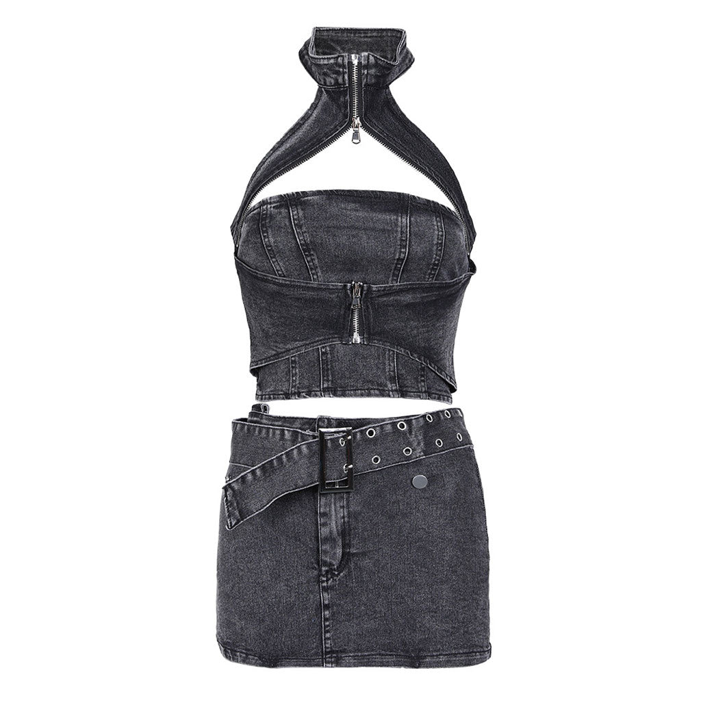 Recalling rugged allure from eras past. our designer denim set seamlessly blends contemporary flair with meticulously crafted work-in effects. This two-piece skirt set exudes rebellious charm and vintage aesthetics. The sleeveless top flaunts a zip-front halter neck style with a daring chest cutout and functional zippers. culminating in a chic crop hemline. Complementing the top. the high-rise denim mini skirt evokes a well-worn charm. accentuated by a wide buckled belt and concealed zip fly. Rear patch pockets add utility and rustic elegance. completing this timeless portrayal of do-it-yourself style.