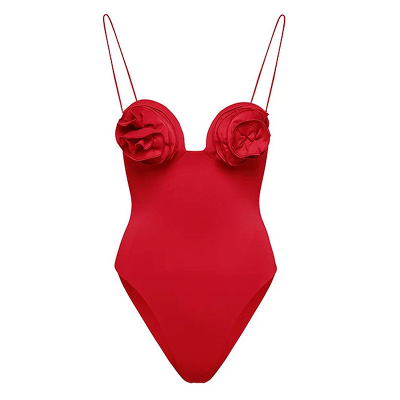 Plan your summer escape with this effortless chic rosette bathing suit. This captivating designer one piece in rich red color is a perfect blend of boldness and sophistication. featuring lively 3D flower applique on the daring sweetheart neckline adding a touch of femininity and allure. while the cheeky cut provides a daring and stylish look. Not limited to poolside fun. you can cleverly pair it with a short skirt for the party. In the spotlight. radiate your distinct charm and become the center of attention. Plan your summer with this attention-grabbing swimsuit. and be the shining star at any party or gathering.