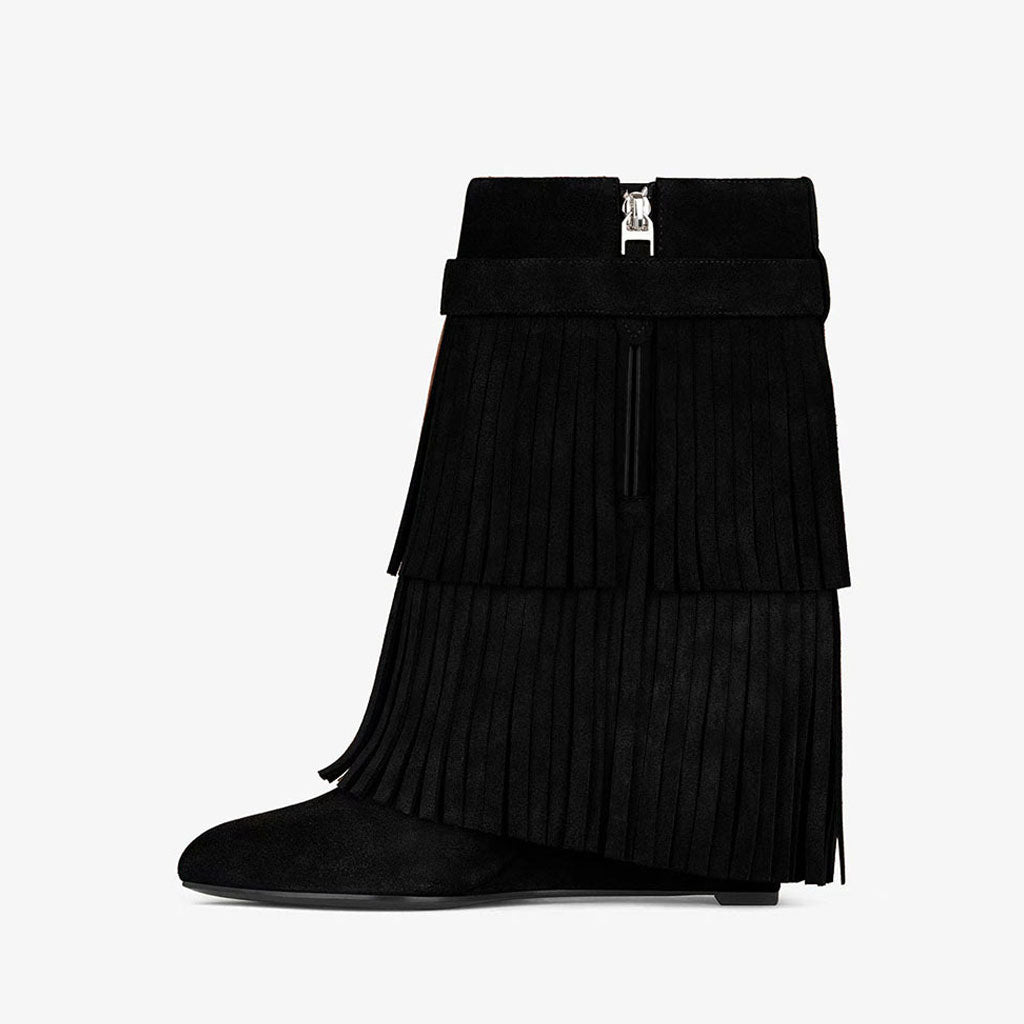 To borrow our favorite boho-chic motif is not that easy until you get this flirty shoe. Detailed with beautiful hanging fringes in tiers. they curated from all-over imitated suede material with super soft-touching. Peeking out from underneath the playful tassels. they have an almond toe and a wedge heel with elegant finishing touch. To light up the monochromatic shoes. they inject a touch of calm and cool with the silver-finish metal padlock detailing at both sides. which is exactly a delightful contrast with the overwhelming romance from the floaty fringes. They come in easy-wearing style with the half metal inside zips along the legs. For a smart casual outfit idea. try jeans tucked into these ankle boots paired with a blazer or shirt. Here comes the fashionista!