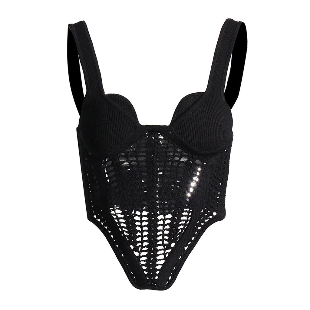 A chic crochet corset top adds mesmerizing quality to your outfit. The sleeveless corset style is knitted in a transparent crocheted look whilst stretch ribbed straps and back panel add a comfortable structure to the top that's flattering without being too constricting. The sweetheart neckline is distinguished with dual-layer for a perfect balance of modest and sexy. We love its dipped hem. tonal binding and exposed metal rear zip closure enhancing the sculpting fit. Match it with baggy jeans and chunky sneakers to imbue a hint of nonchalance into your cool spirit.