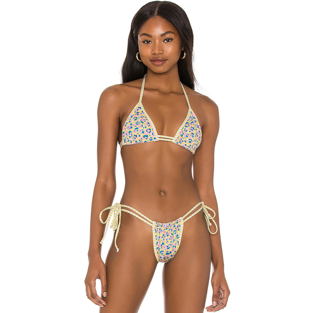 Kissing the sun with this floral print bikini set. The two piece swimsuit features a sliding triangle bikini top with double front tie for perfect fit. vertical spaghetti ties at neck or at back. removable pad cups. stripe pattern brim. and the matching bikini bottom has double straps on each side and scrunch cheeky back.