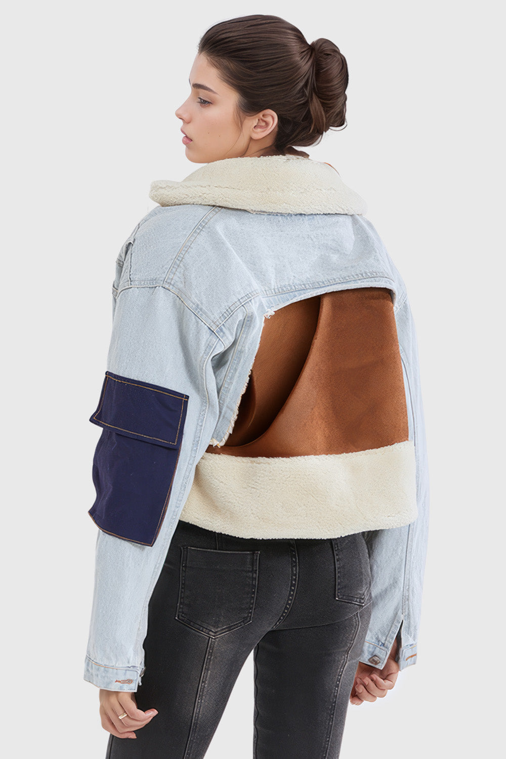 Stay warm and stylish with this luxurious fur jacket with denim inserts. Featuring a cozy white fur lining. a front zipper and two patch pockets. plus a pocket on the sleeve and metal buckles for fastening. this jacket provides both comfort and fashion.