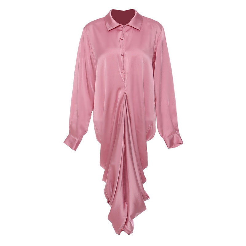 Draped in elegance. our designer draped dress is a vision of refined beauty. Meticulously crafted from luxurious fabric. this gown is the perfect choice for special events. The elegant event dress features a sophisticated shirt-style bodice adorned with a classic fold-over collar. complemented by a chic front half-button placket. Long sleeves with buttoned cuffs add a touch of timeless charm. The graceful gathered skirt enhances your silhouette. while the side ruched detailing adds subtle allure. And let's not forget the mesmerizing gathered back. which adds a captivating element to the ensemble. Effortlessly elevate your style with this enchanting midi cocktail party dress. ensuring you make a striking statement at any event.