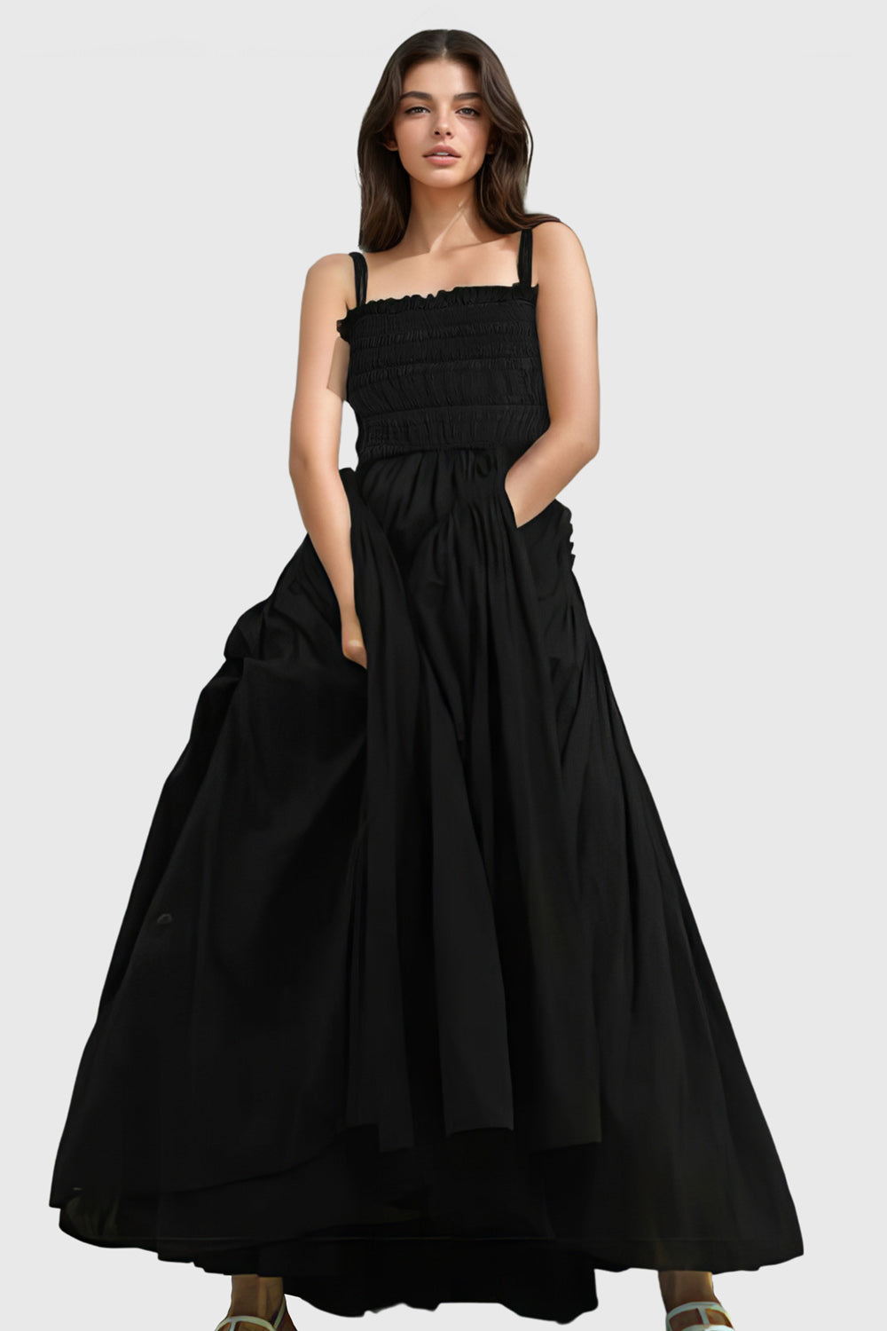 Long. elegant dress with square neckline and thick straps. The dress is fitted and elastic in the upper part. There are two pockets at front and the back has cut outs.