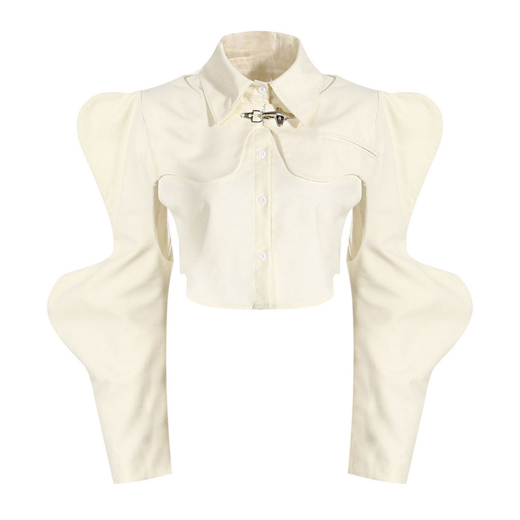 This two-piece set is begging for a spotlight moment in your wardrobe. Distinguished with the wavy silhouette along puff long sleeves. the bolero-style shrug is in a super short length with an open front and a silver-toned clipping lock for a polished. smart accent. The vest is in a shirt style with the folded collar. button-front profile and a cropped vented hem. You'll be surprised at the wavy rear hem as a head-turned design. Feel free of restriction when wearing both of the two pieces as the armpits are meticulously made with large cuts for your movement. Wear yours with a black leather skirt and boots to complete the chic look. You will treasure each detail of this style as an eternal summertime memory.
