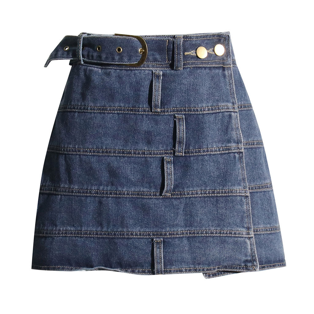 A contemporary interpretation of a classic wardrobe staple. The medium washed denim fabric exudes casual charm and versatility. But what truly sets this denim miniskirt apart is its modern patchwork design featuring all-over belt loops. A sleek buckle belt cinches the waist. adding structure and definition to the high-waisted A-line silhouette while also serving as a stylish embellishment. Whether paired with a tucked-in blouse for a polished look or styled with a graphic tee for a more casual vibe. this designer skirt is versatile enough to suit any occasion.
