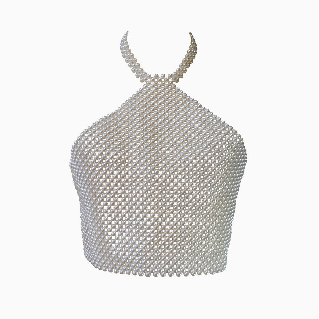 Dress to impress with our luxurious designer pearl body jewelry line! Featuring a halter neck and an open back with lobster clasps. this cropped faux pearl top is sexy and chic. Cropped and semi-sheer. perfect for layering and making a bold statement.