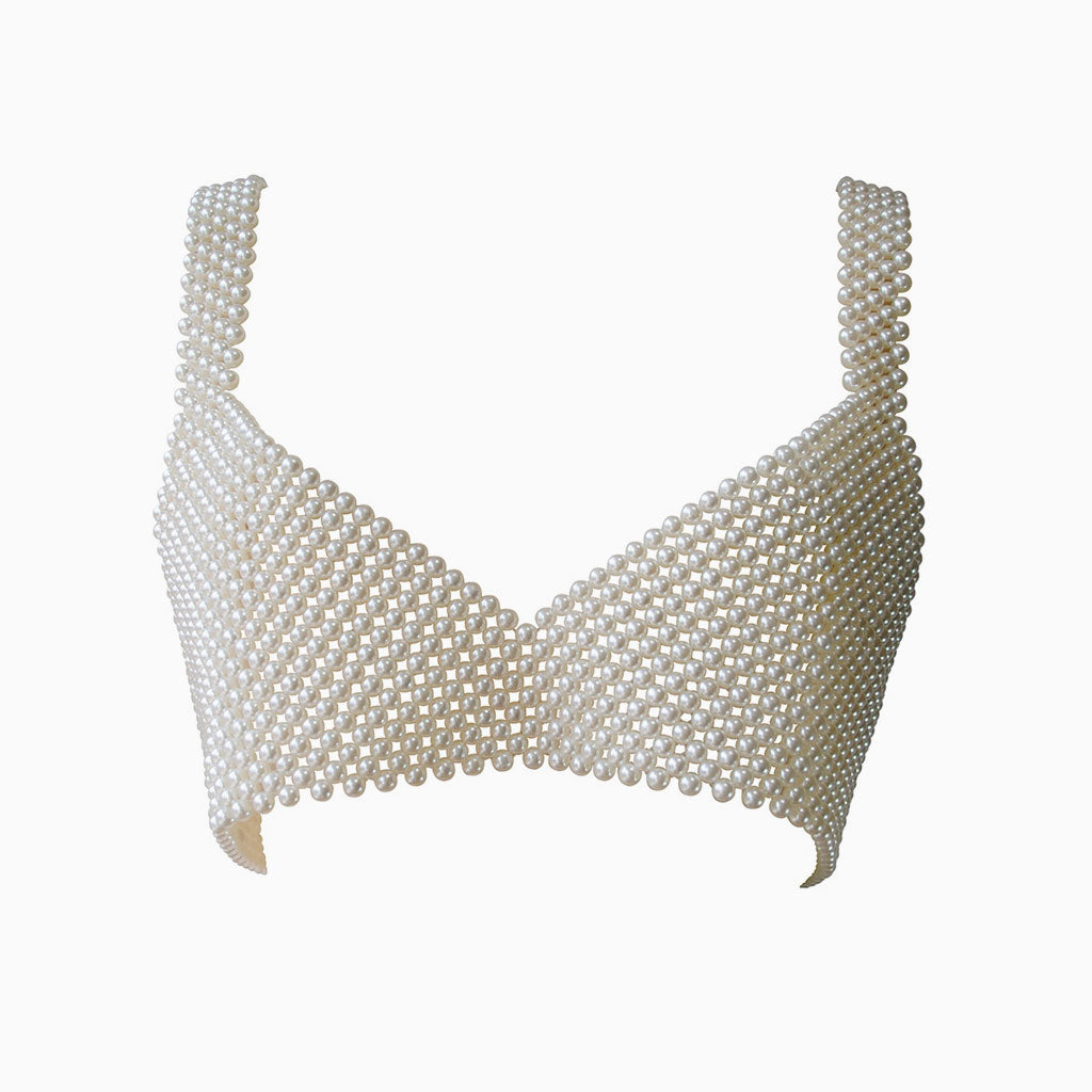 Glam up with our opulent body jewelry line! This luxury designer pearl bralette. adorned with pearlized faux pearls. is a fusion of style and sass. featuring a chic V Neck and wide shoulder straps. With its cropped length and semi-sheer design. it's perfect for effortless layering.