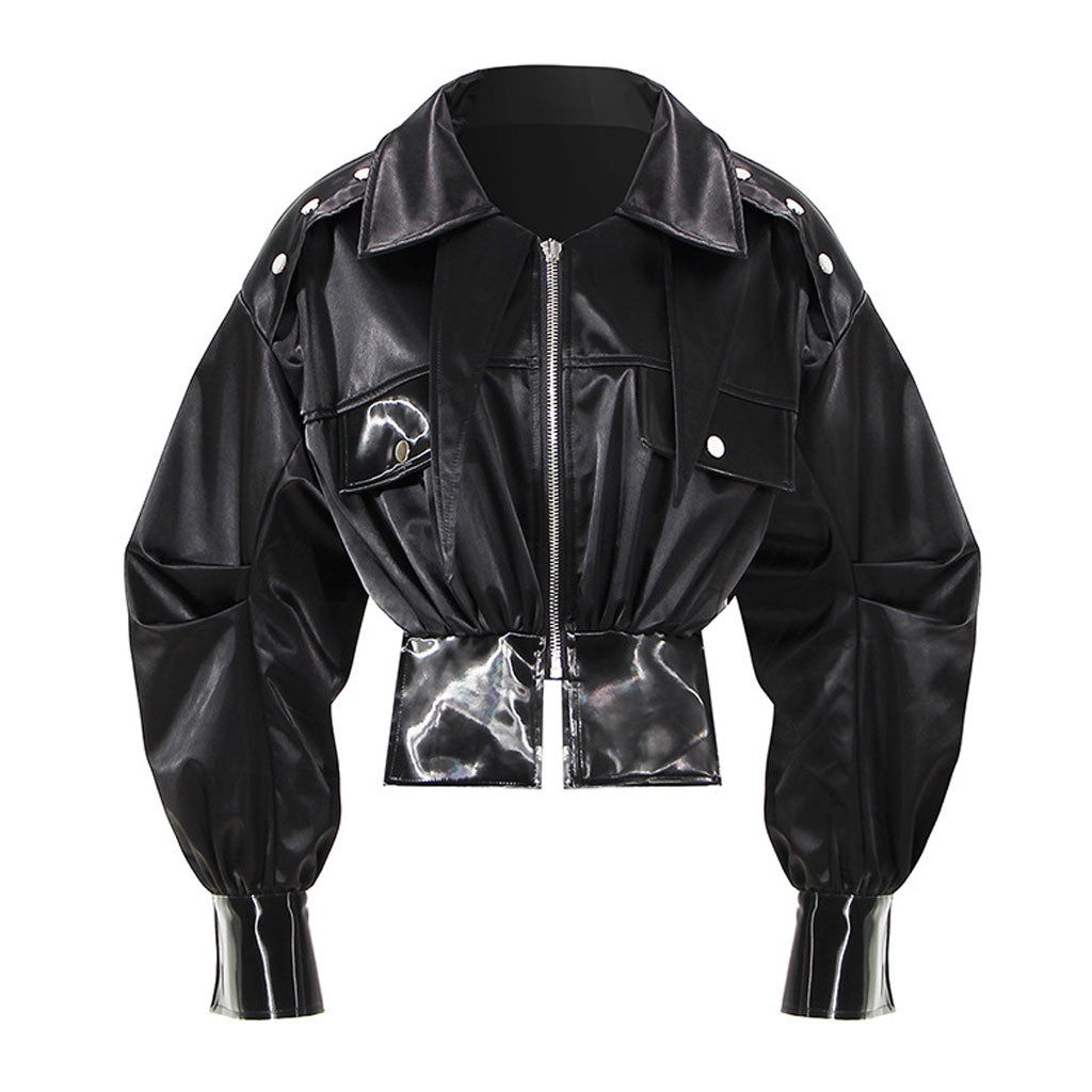 The LUXE designer brand has been delivering quality basics at accessible price points since the beginning. and this cool leather jacket is no exception. Made from the faux leather with glossy leather highlighting on the cuffs and breast pockets and the crop hem. the jacket is designed to be oversized. featuring a metal zip-up detail. folded collars. epaulette shoulders and voluminous sleeves that gives an architectural shape to toughen up the look. The crop silhouette is enhanced with a gathered slit waist. offsetting the exaggerated silhouette of the upper part. The storm flap at the back is highlighted with a metal button. giving so much dimension to the look. Wear yours with fitted black pants and chunky boots to imbue a hint of rock-and-roll attitude. It's a rare masterpiece!