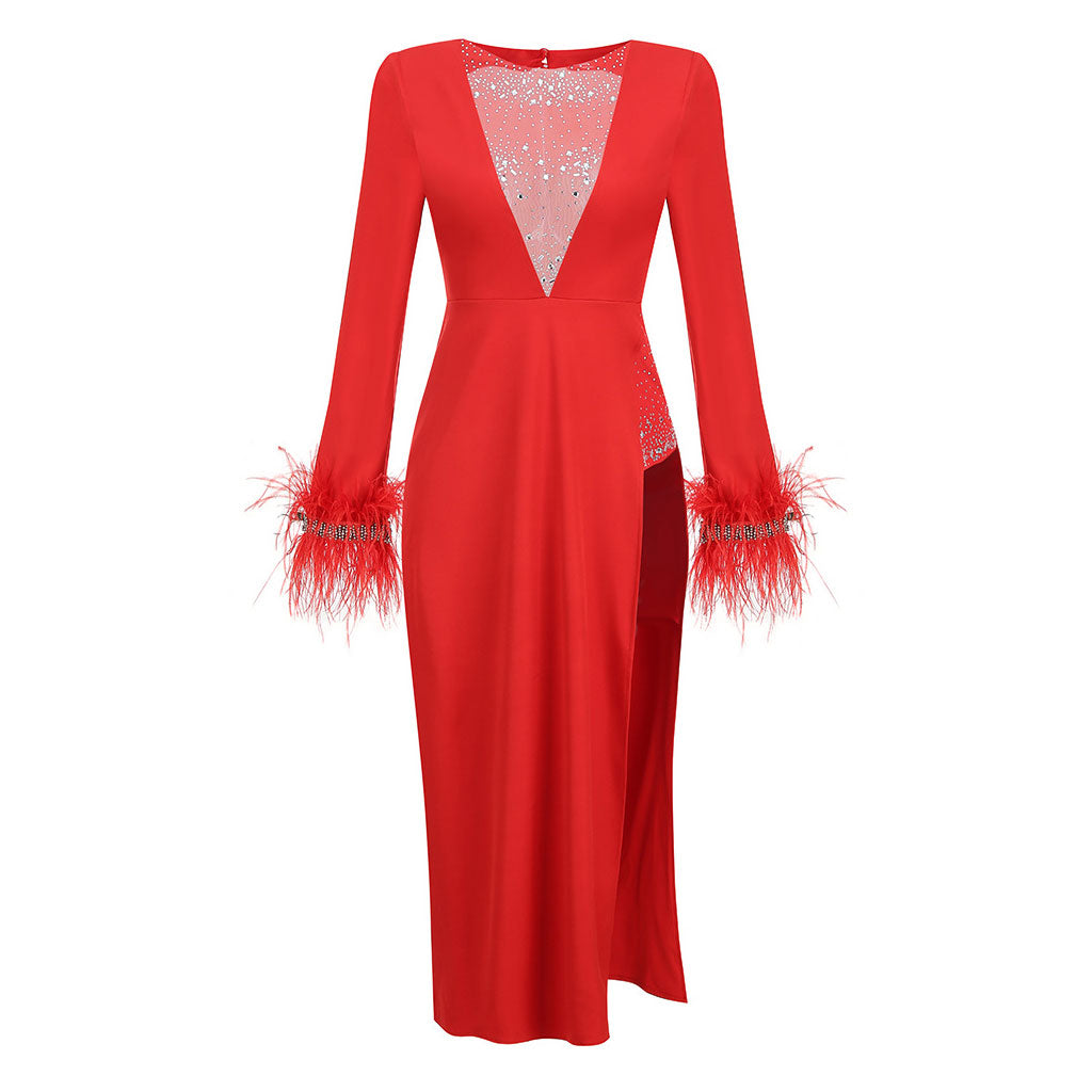 Elevate your fashion game by opting for a sultry red dress. Our designer dress pays attention to all the luxury details that you want. featuring strong padded shoulders. long sleeves. faux feather cuffs and crystal embellishment on the neckline. waist and cuffs. The red dress is an ankle-grazing maxi length which boasts a sexy plunging neckline and a jaw-dropping split with see-through mesh spliced design. The open back turns up an unexpected sexy dial with buttons and concealed zip fastening for security. Wear it with sparkly crystal heels. which deserves a winning spot in your wardrobe.