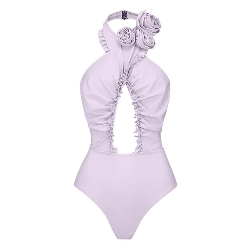 Glide across the pool in pure elegance with our glamorous rosette embellished one-piece beachwear. This luxurious designer swimsuit allows you to embody timeless beauty as you make a stylish entrance. The captivating halter neck adorned with rosette applique detailing exudes sophistication and allure. With a graceful ruffle-trimmed cut-out on the front. this swimsuit strikes the perfect balance between playful and refined. The detachable soft bra pads and moderate coverage ensure both comfort and style. The bare-there backless design adds a touch of sensuality. making it a mesmerizing choice for any aquatic setting.