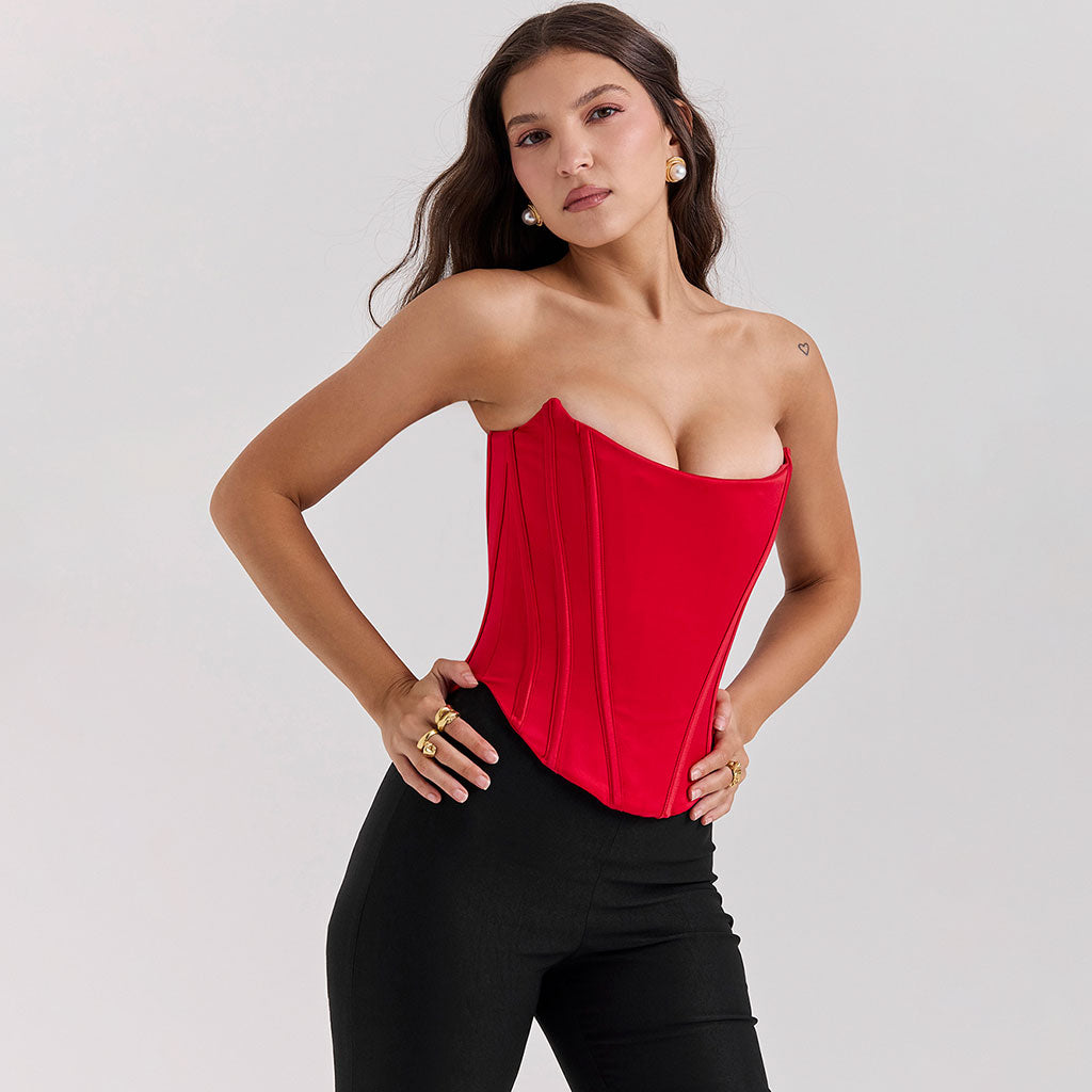This edge designer strapless corset is a pinnacle of allure and sophistication. Featuring a distinctive sweetheart neckline and playful lace-up back closure. this cropped tube top commands attention and offers a bespoke fit. With a refined curved hem. it elevates your silhouette effortlessly. Whether you're stepping into the nightlife or making a bold entrance. this stunner promises to elevate your style game with confidence and sophistication.