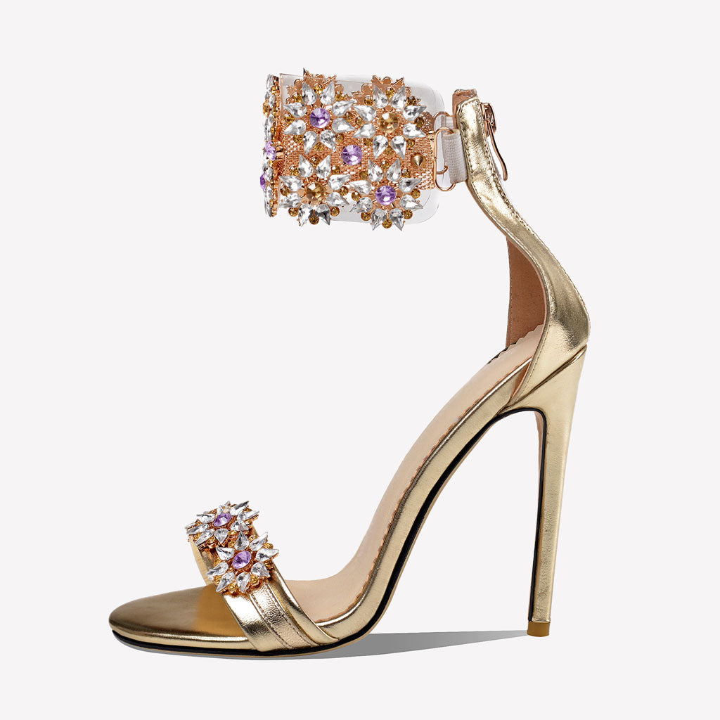 Just think about the light that catches the crystal on this shoe. Yes. you'll be shining. This beauty will infuse fashion's current party-ready spirit into your outdoorsy outfits by the opulent floral strass embellishment on the single toe-strap and the ankle strap. The ankle strap is such a work of art that's detailed with an intricate arrangement of decent crystals and luxe golden canvas. There's a transparent PVC strap fixed on the strap which is connected with elastic bands attaching to the ankle-wrap with a rear zip for easy wearing. Set atop a 4.72-inch cigarette heel. this wow-worthy pair is sure to inject a dose of confident sexiness within you. Perfect option to don for garden parties and soirees. this pair of sparkly sandals will look stunning with mini dresses.