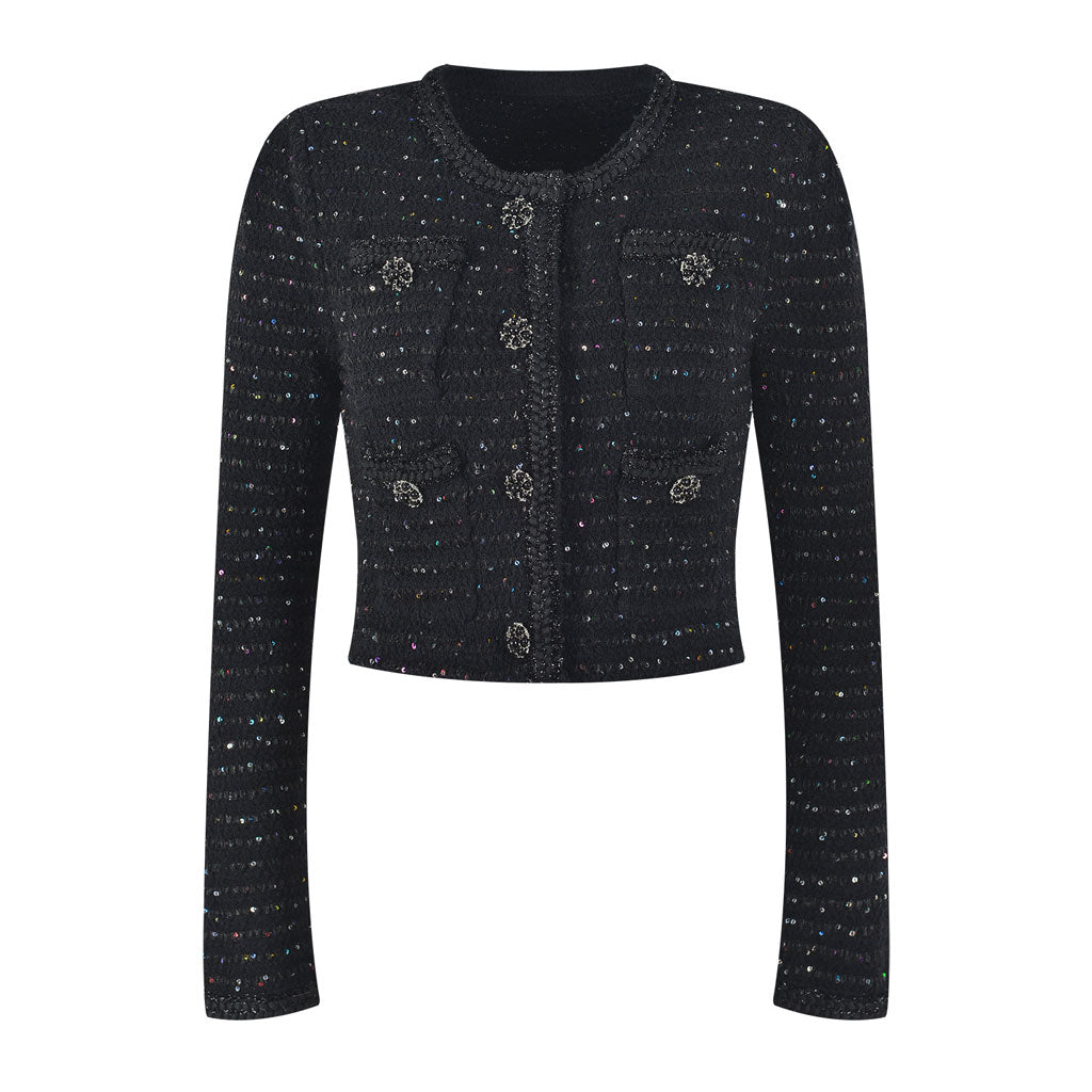 Catch every eye with this textured black cardigan. a chic blend of acrylic and cotton. Its front button-up placket. adorned with shimmering crystallized buttons. adds a luxe touch to any outfit. The long sleeves. finished with unique braided cuffs. blend traditional charm with modern flair. Cropped to perfection and bedazzled with multicolored sequins. this opulent designer cardigan is a statement piece that's as comfy as it is classy. Perfect for adding a bit of 'razzle-dazzle' to your everyday with our colorful sequin knit skirt.