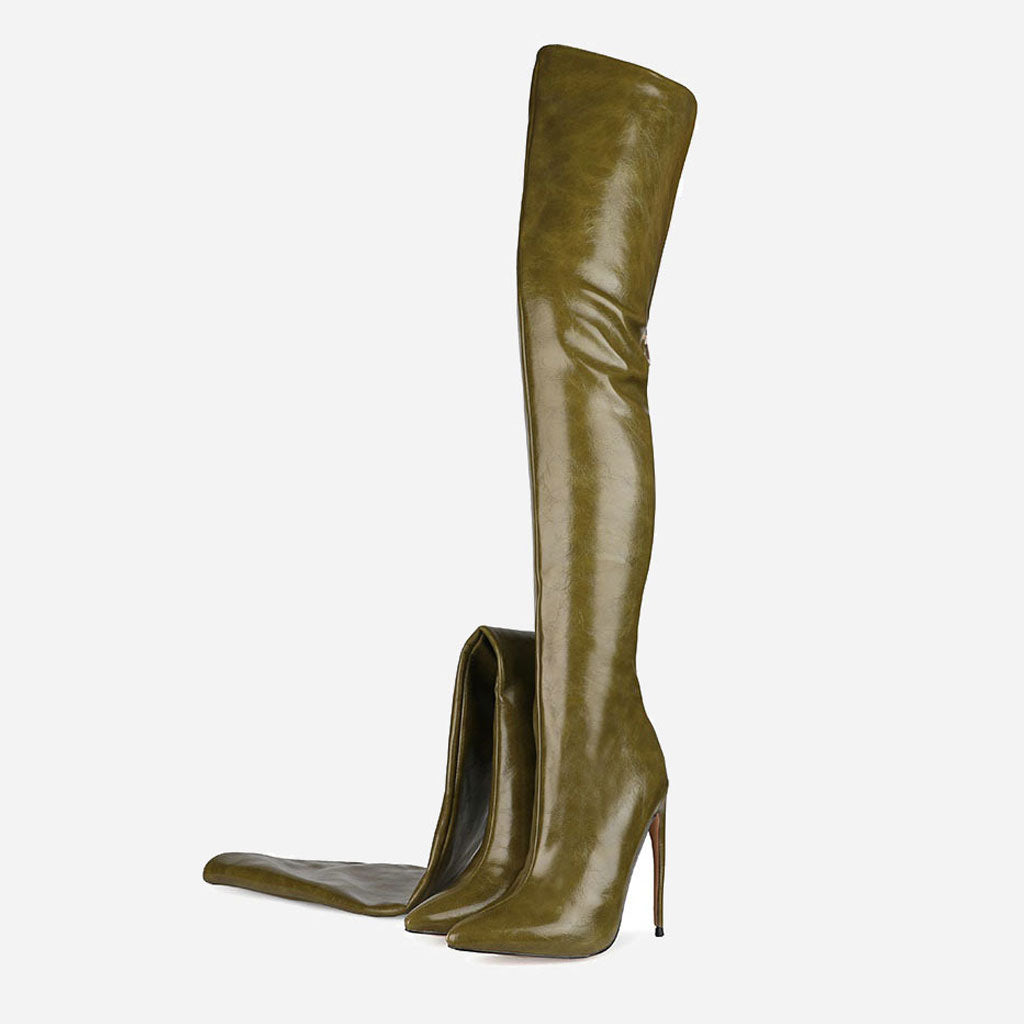 If you're going for some kinds of sassy looks. this pick would be on your purchase list for a few reasons. We love the way how subtly pointed toe makes for a streamlined and slink shoe silhouette. The stiletto heel is tall and thin. which leaves you with desired height and keeps your feet from looking clunky. Made from refined imitative leather. they are soft-touching and feel so smooth. Understated and sophisticated. the subtle textured exterior is definitely the true reason that you must take them back home. The exposed back zippers that run high up to the knee will surely secure your foot so perfectly and also leave your thigh loosen for a reason of easy movement. They come in all the calm colored palette with burgundy red. olive green and Taupe pink. but we still have shiny silver for your sake.which are chef's kisses with your mini dresses for the cold weather.