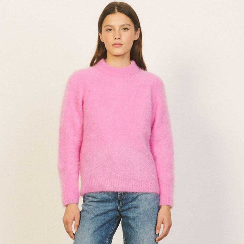 In a bright pink color. this luxury knit top would suit you so well in fall and winter. Made of mohair. polyamide and elastane. this it-girl pullover sweater also features a ribbed round neckline. long sleeves with dropped shoulders. a relaxed figure with a ribbed touch at the hem. Love the way you put on this bright color winter piece. Our designer clothes collection also contains many stunning sweaters for women.