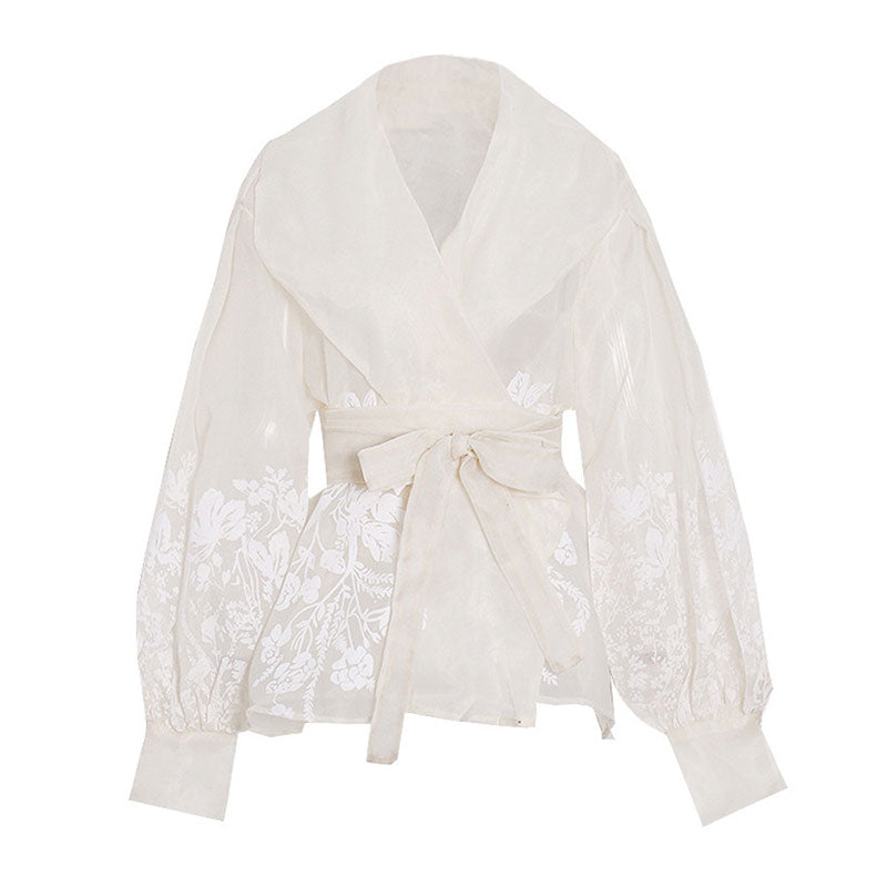 Add a touch of delicate beauty and refinement to any outfit with our sheer organza jacket. The subtle floral design effortlessly exudes grace. while the oversized fold-over collar and lantern sleeves create a gentle. flowing silhouette. Accentuate your waist with the tie-belt. creating a flattering hourglass figure. The unlined construction offers a transparent quality. adding to its allure and sophistication. Whether it's for a romantic dinner or a day at the office. this designer blouse is a must-have addition to your wardrobe.