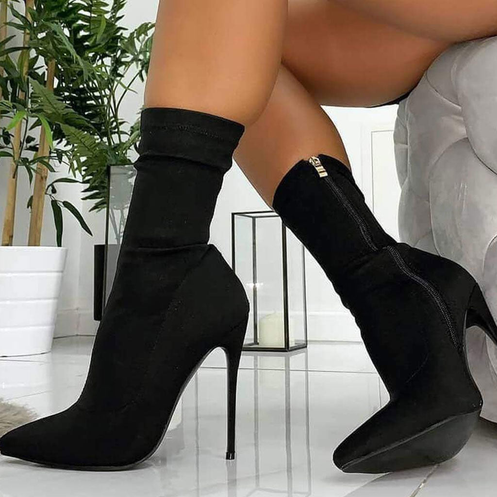 Having a sleek silhouette in a night out black tone. this pair of classy boots is an effortless pick for your outfit from season to season. Made from imitated suede fabric. these luxury stiletto boots also feature a mid calf with a pointed almond toe. a slender high stiletto heel. a slip-on style with side zip fastening. Style this pair with our designer outfit to rock yourself at your upcoming event. Whether it is a party. homecoming. anniversary or others. our designer shoes collection will contain more designer boots for women.