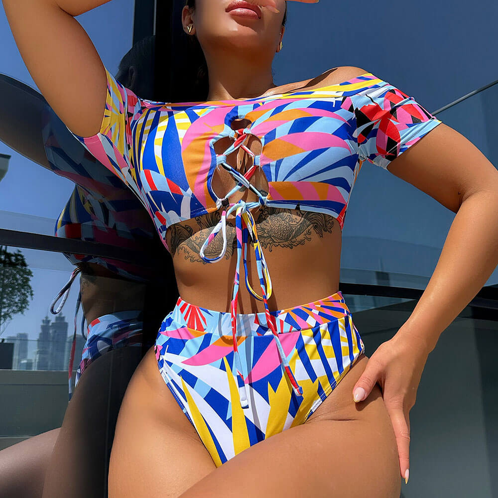 Dive into paradise with our vibrant tropical leaf-patterned surfing swimwear set! Embrace the sun-kissed vibes in style with an off-the-shoulder neckline swim top featuring short sleeves and a fashionable lace-up closure at the front. Enjoy customizable comfort with removable soft padding cups and flaunt your figure with the trendy crop length. Complete the look with our high waisted bikini bottom. designed with cheeky back coverage for an irresistible beach-ready silhouette. Elevate your swimwear game and turn heads wherever you go.